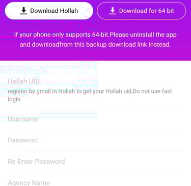Inside the Hollah app, you will need to register using your Gmail account to get your unique "Hollah UID". The instructions explicitly state "Do not use fast login".